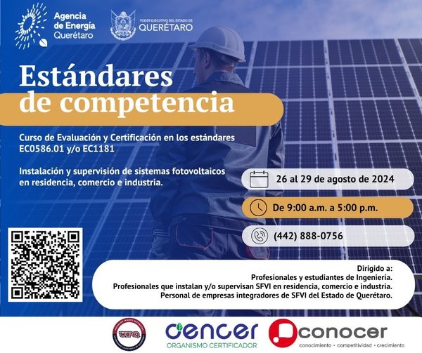Es un placer para la Agencia de Energía del Estado de Querétaro (AEEQ) invitarlos cordialmente a participar en el curso de profesionalización en el estándar de competencia en sistemas fotovoltaicos E.C. 1180
