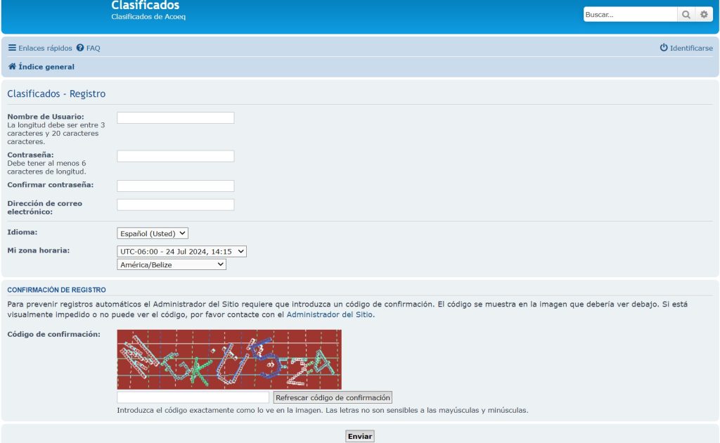 Poner un nombre de usuario que será su Alias con el que se publicaran los anuncios, una contraseña de al menos 6 caracteres, confirmar la contraseña, dirección de correo electrónico a donde llegaran las notificaciones de respuestas de sus anuncios, el Idioma se queda igual, Mi zona horaria también se queda igual, y resolver el puzzle del recuadro, en el ejemplo de la pantalla el código es: NGKU524A y ENVIAR.
